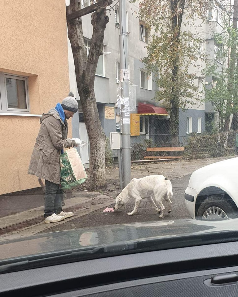 Femeia a fost șocată de ceea ce a văzut, așa că s-a dus la omul sărman, pentru a-l întreba de ce a decis să dea de mâncare patrupedelor, chiar dacă și lui îi era foame.