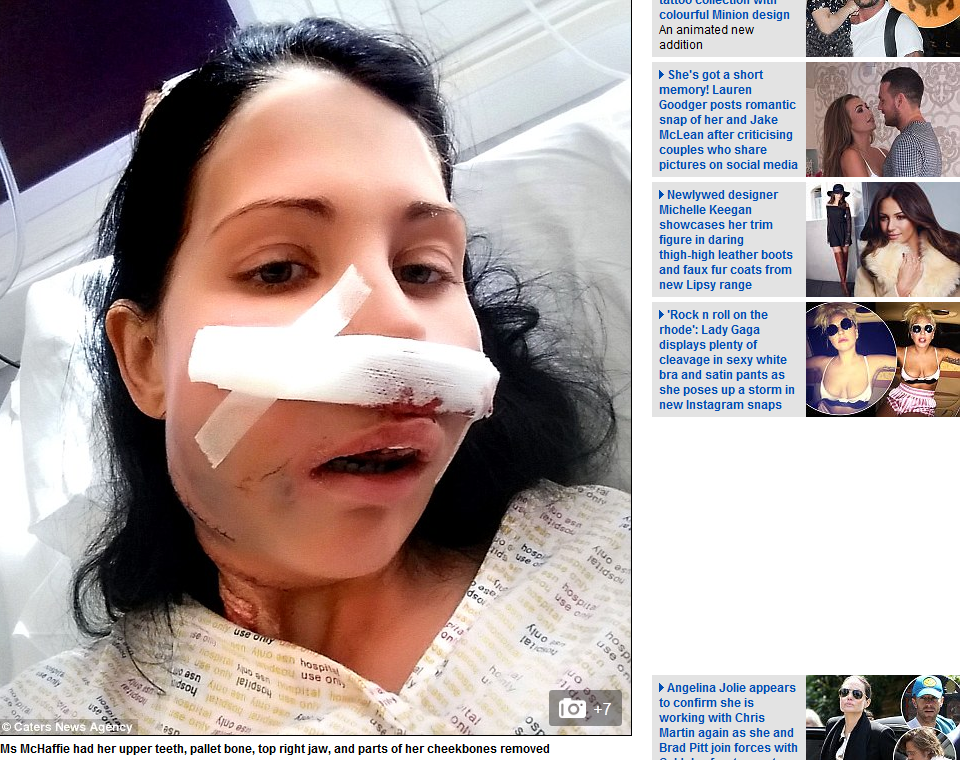 Abia mai tarziu, femeia a fost diagnosticata cu maladia crunta. Pentru a avea sanse de supravietuire, femeia de 25 de ani, mama a unei fetite, a fost pur si simplu desfigurata dupa ce i-a fost supusa unei operatii in care i-a fost taiata o bucata de fata: dintii din partea superioara, maxilarul si o parte din oasele care sustineu obrajii, scrie Daily Mail.