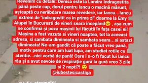 „Denisa este la Londra, îndrăgostită până peste cap, dorul de Iancu o macină mărunt, așteaptă cu nerăbdare marea revedere, iar Iancu… Iancu, extrem de „îndrăgostit ca în prima zi” doarme la Emy Alupei în București de vineri seara începând, așa cum ne confirmă și poza mașinii lui făcută în fața casei ei! Mașina a fost văzută vineri noaptea, tot la aceeași adresă, și sâmbătăt dimineața și sâmbătă seara… și astăzi dimineața!”, este mesajul care apare în dreptul fotografiei în care se vede mașina lui Iancu Sterp de la Survivor în fața casei lui Emy Alupei.