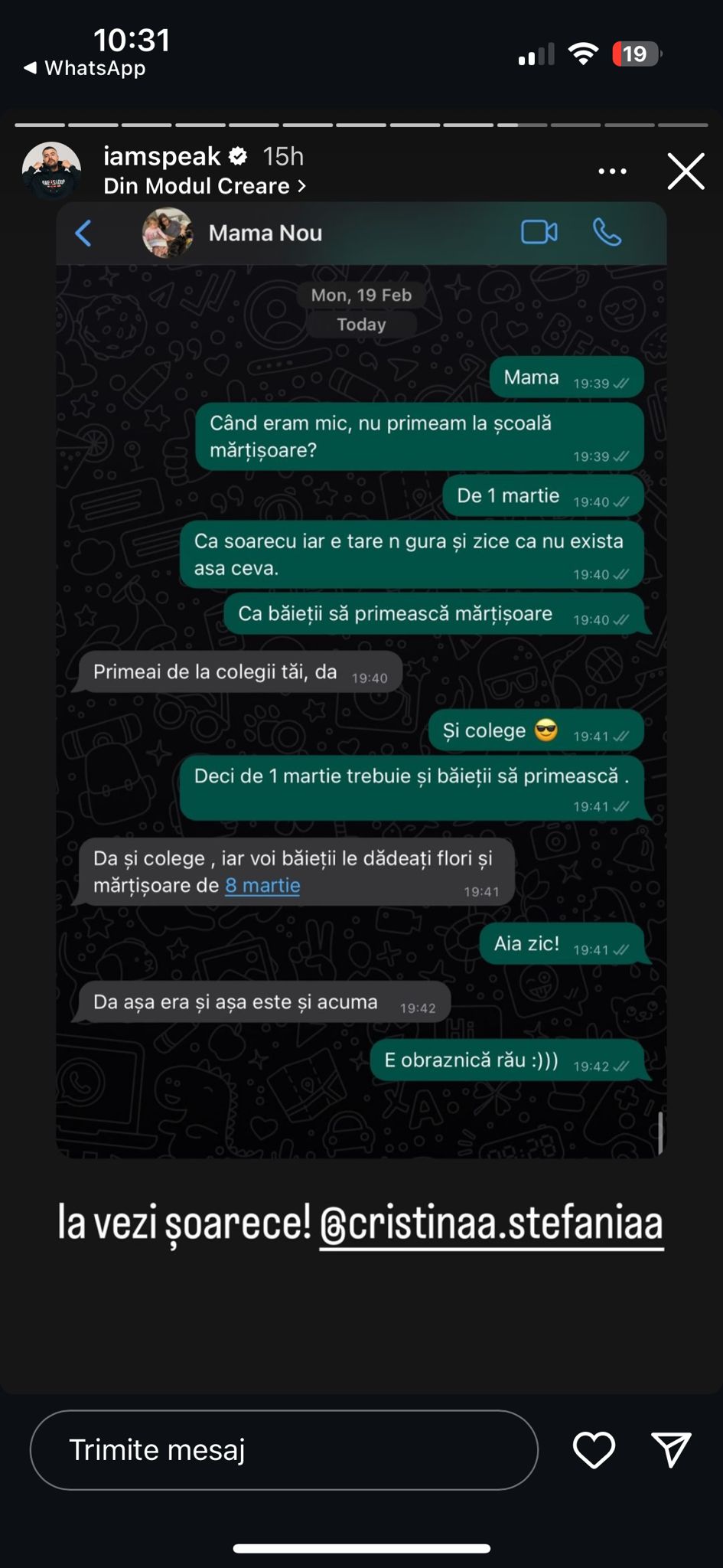 Se pare că Ștefania i-ar fi spus iubitului ei că băieții nu trebuie să primească mărțișoare de 1 Martie, însă Speak a contrazis-o și i-a scris imediat mamei sale care a lămurit întreaga situație. Conversația lui Speak cu mama sa a ajuns imediat pe Instagram, iar fanii s-au distrat copios.