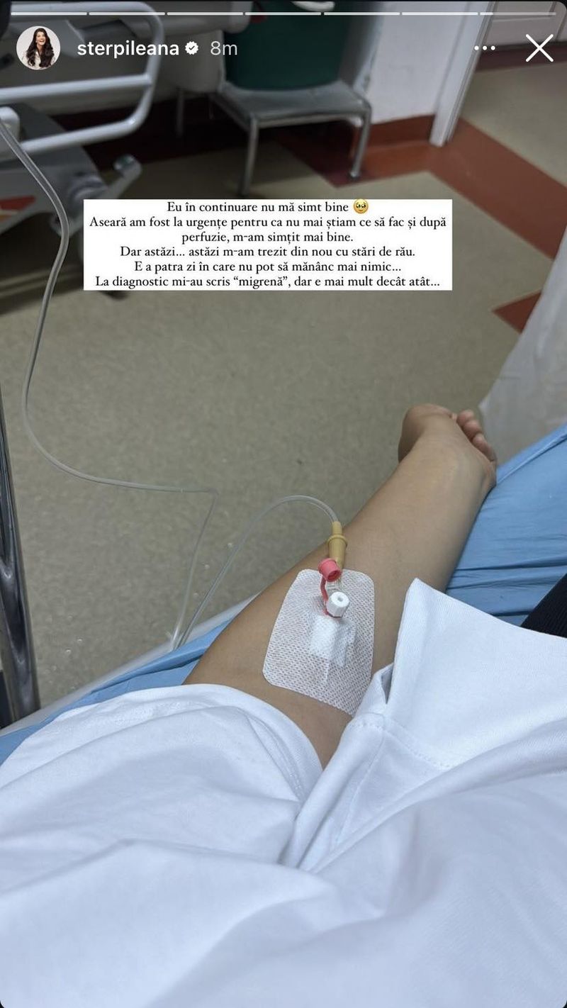 „Eu în continuare nu mă simt bine. Aseară am fost la urgențe pentru că nu mai știam ce să fac și după perfuzie, m-am simțit mai bine. Dar astăzi… astăzi m-am trezit din nou cu stări de rău. E a patra zi în care nu pot să mănânc mai nimic… La diagnostic mi-au scris „migrenă”, dar e mai mult decât atât”, a scris Ileana Sterp, pe Instagram.