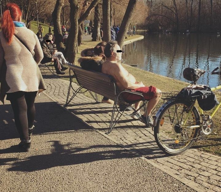 Poza a fost facuta in parcul IOR, acolo unde un barbat si-a suflecat pantalonii, a renuntat la tricou si s-a asezat pe banca pentru a se bucura din plin de razele soarelui. Cu catrafusele pe portbagajul bicicletei si cu privirea pierduta in zare, bucuresteanul a intrat in lumea lui si a ignorat privirile carcotase ale trecatorilor.
