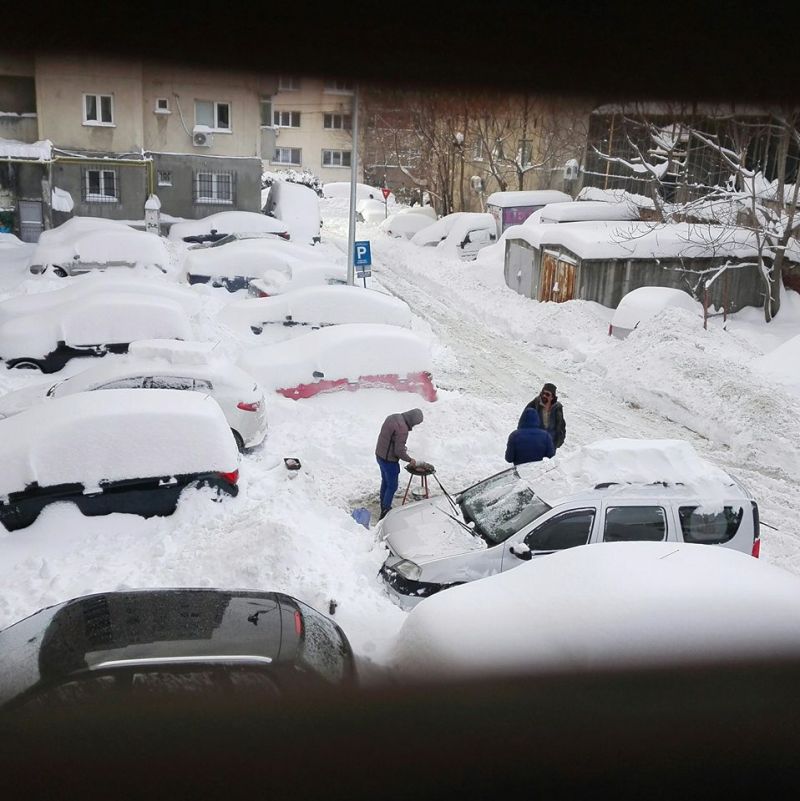 IMAGINEA ZILEI! Cum s-au relaxat niste romani dupa ce au dat jos zapada de pe masina? Ce-am gasit intr-o parcare ne-a facut sa ne tinem de burta de la atata ras