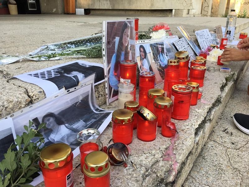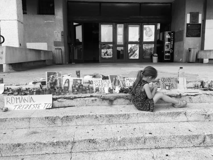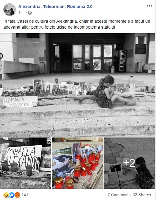 O fetiță din Alexandria, Teleorman, a fost surprinsă în timp ce stătea pe scările Casei de Cultură din Alexandra, în dreptul unui altar făcut în memoria fetelor din Caracal, Alexandra și Mihaela, care au fost ucise de presupusul bărbat, viovat de răpirea lor, și anume Gheorghe Dincă.