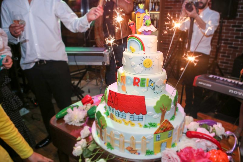 Tortul a parut cules din gradina de zarzavat, pentru ca a fost ornat cu figurine din martipan care ii reprezentau pe ei: ardei gras (Andrei), ardei capia (Alexandru), vanata (Adela) si morcov (Radu). Povestea legumelor a fost declinata de parintii micutului in fel si chip: invitatia la eveniment si panoul foto au fost desenate cu astfel de simboluri, briosele au avut figurine cu ardei iuti.