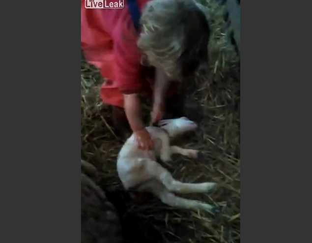 Imagini greu de privit! Fetita asta de trei anisori aduce pe lume un miel! Doamne, e coordonata de mama ei si se comporta ca un veterinar! In loc sa se joace, ea se ocupa cu asa ceva! Dureros!