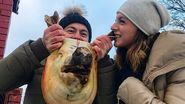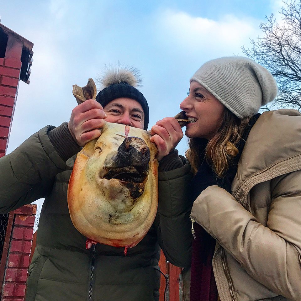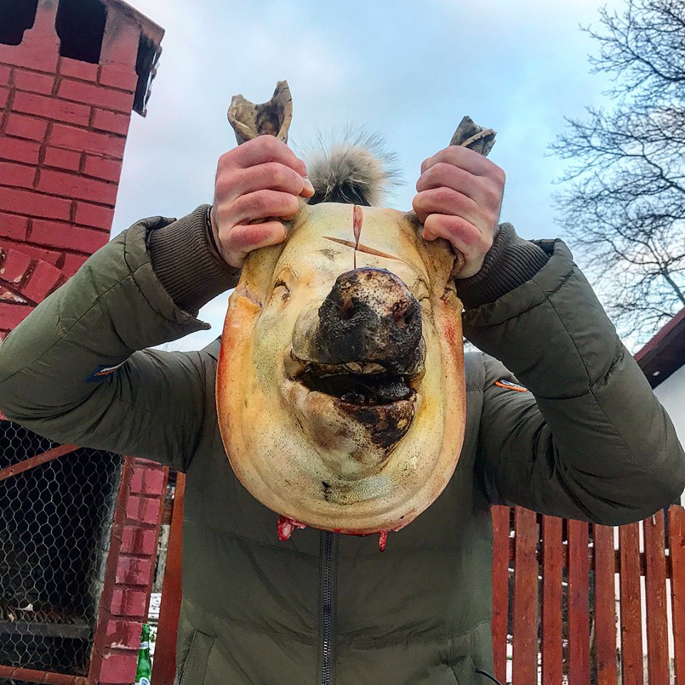 Dupa ce animalul a fost injunghiat si parlit, Norris Mageanu l-a decapitat, apucandu-l apoi de urechi, ca pe un trofeu. Norris a pus capul porcului in dreptul figurii sale, ca si cum ar fi o masca, in timp ce logodnica sa a sarutat urechea animalului. „Doamna si porcul. La pagani”, a comentat, cu umor, fostul iubit al Corinei Danila.