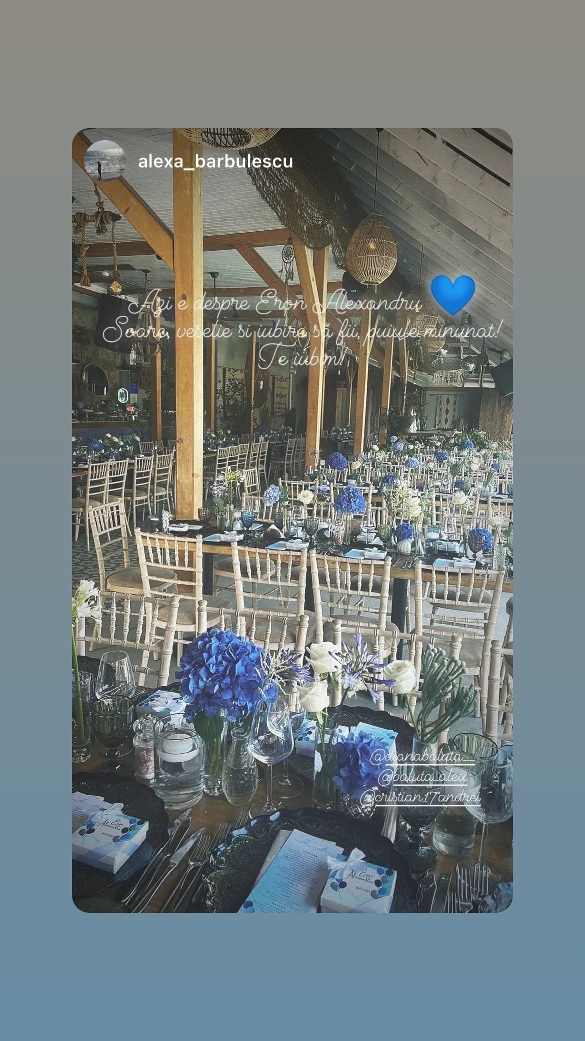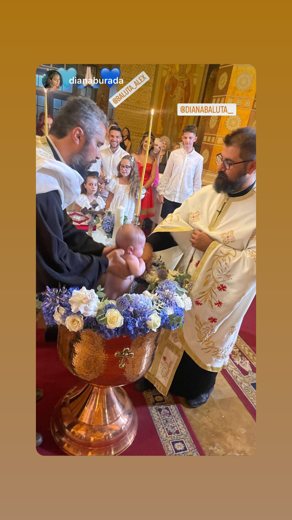 Evenimentul a fost unul spectaculos, ținut la o piscină de lux, amenajată special pe un fond albastru, plină de baloane. Inclusiv florile de la cristelnița din biserica în care a fost creștinat bebelușul au fost de aceeași culoare albastră. Doar îngerii, veniți pe post de ursitoare, au fost albi și au animat foarte frumos atmosfera. Alex Băluță a fost extrem de emoționat, chiar cu lacrimi în ochi, și, de aceea, a simțit nevoia să împartă acest moment special din viața lui și celor care îl urmăresc pe Instagram, astfel că a postat mai multe fotografii și clipuri video de la fața locului.
