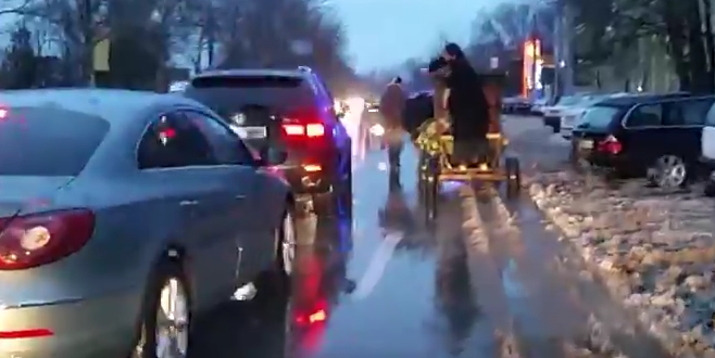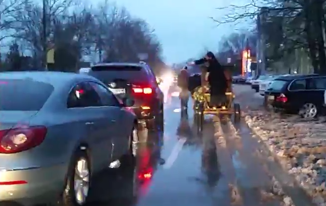 In seara de Boboteaza, un preot, aflat intr-un car tras de boi impartea Aghiasma Mare, in stanga si in dreapta, printre masinile din trafic.