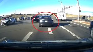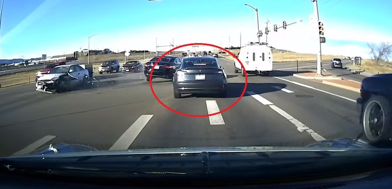 Mașina Tesla reușește să evite un autoturism care ar fi lovit-o în plin, frânând.