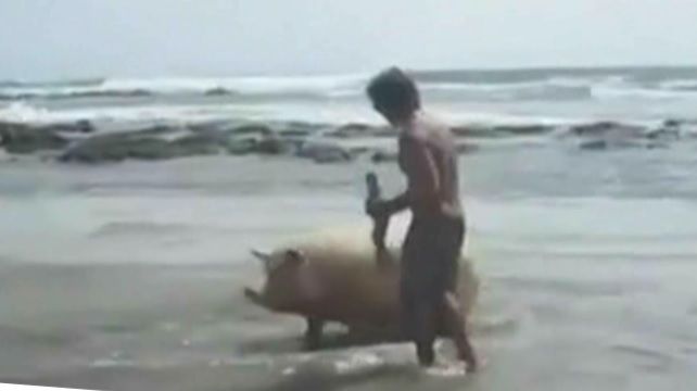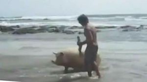 Sa vezi si sa nu crezi! Un porc deschide sezonul estival la malul marii. Si nu e o gluma. Imaginile cu bietul animal, tarat in valuri de stapan, fac valva pe internet.