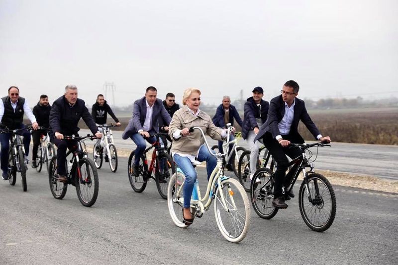 Viorica Dăncilă a fost pusă de echipa de campanie să se plimbe cu bicicleta pe centura orașului Bacău. Fostul premier a primit o bicicletă albă cu ghidon înalt și a mers câțiva kilometri alături de liderii PSD.