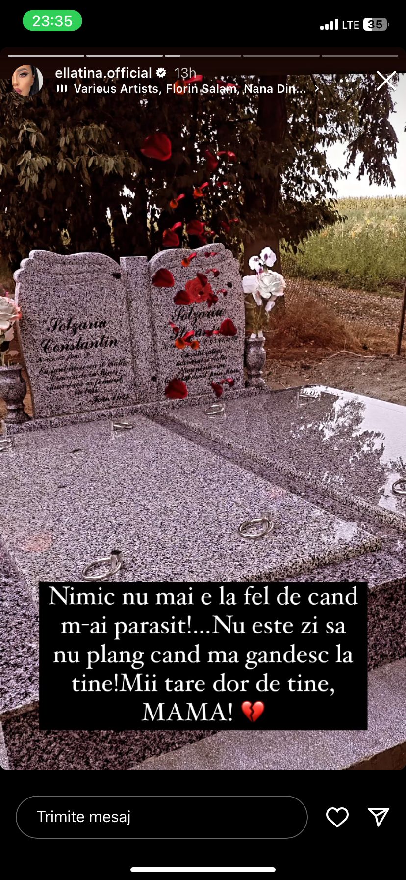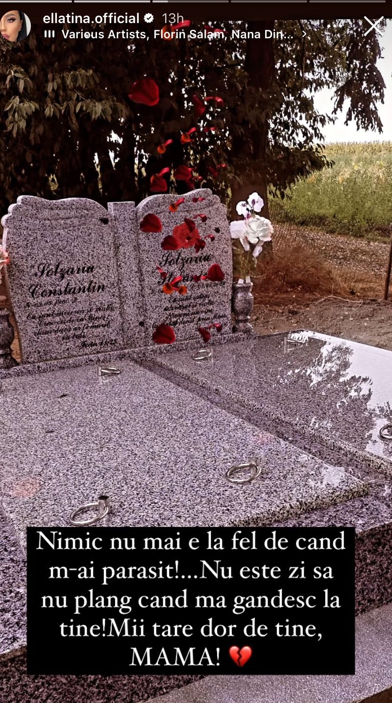 „Nimic nu mai e la fel de când m-ai părăsit!… Nu este zi să nu plâng când mă gândesc la tine! Îmi e tare dor de tine, mama!”, a fost mesajul pe care Ella l-a postat în mediul online, alături de o imagine de la mormântul mamei sale.