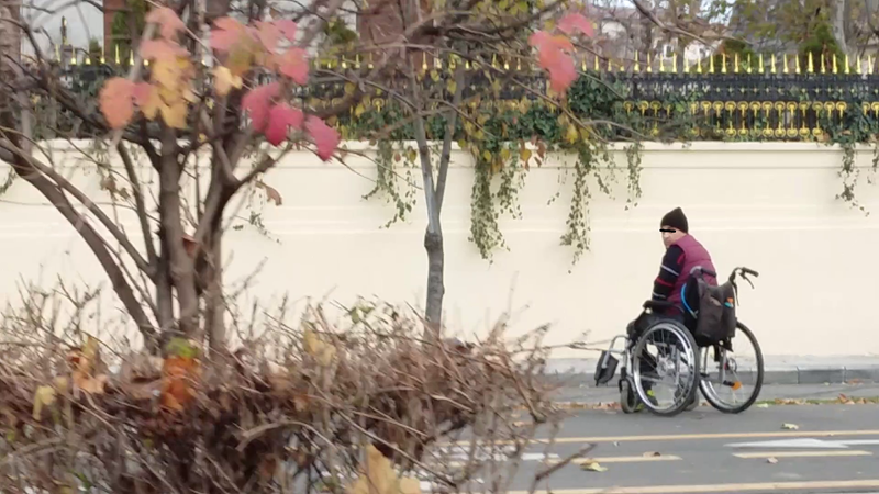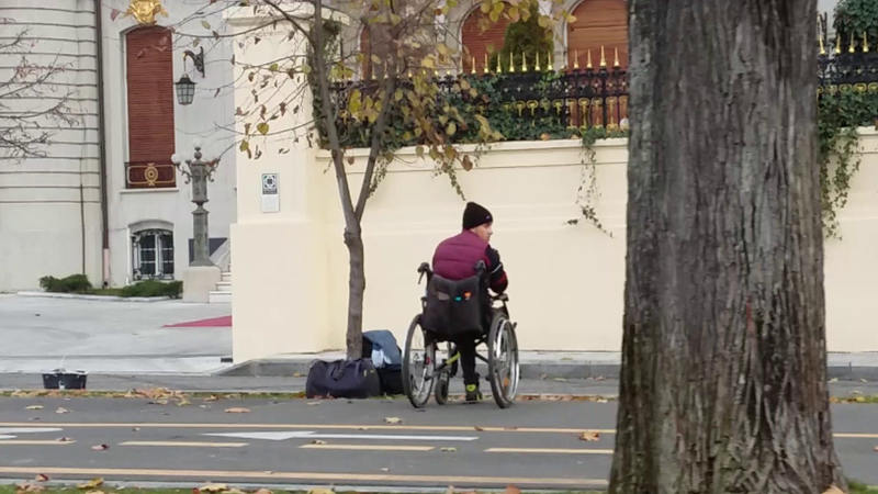 Ei bine cum s-a oprit intemperia, pe trotuar, in fata portilor a aparut un tanar in scaun cu rotile.