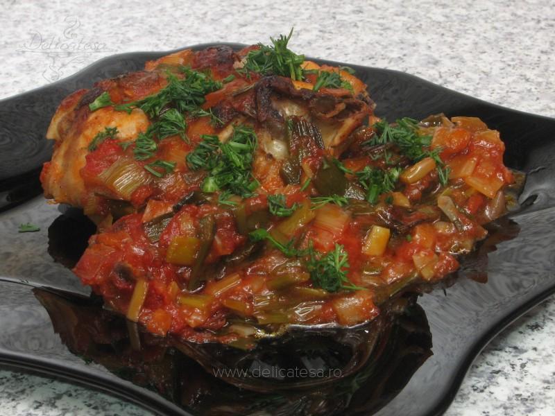 1 kg pulpe de pui – superioare, 4 legaturi ceapa verde, 3 legaturi usturoi verde, 50 ml ulei , 3 linguri pasta de tomate, 100 ml supa de pui, sare si piper dupa gust.