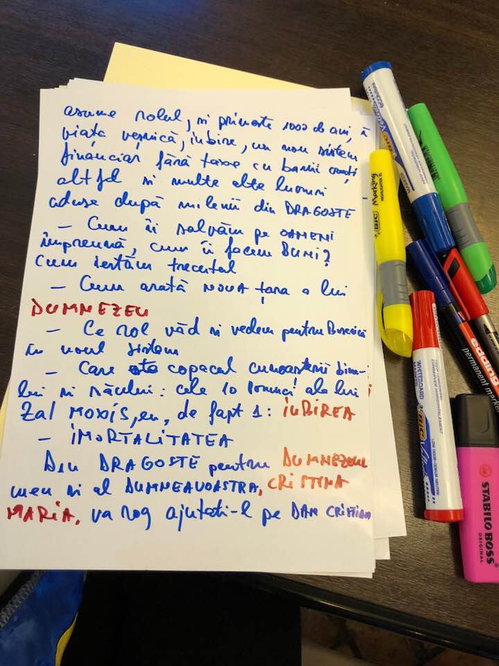 – Cum mă puteți ajuta să o conving pe Cristina Maria, soția mea, Dumnezeul meu și al Dumneavoastră să mă ierte și să mă mai accepte în viața ei, ca soț iubitor ce am fost, sunt și voi mai fi. Lumea se salvează prin Dumnezeu Cristina Maria, dacă acceptă să își asume rolul și primește 1.000 de ani, viață veșnică, iubire, un nou sistem financiar fără taxe, cu banii croiți altfel și multe alte lucruri aduse după milenii de Dragoste