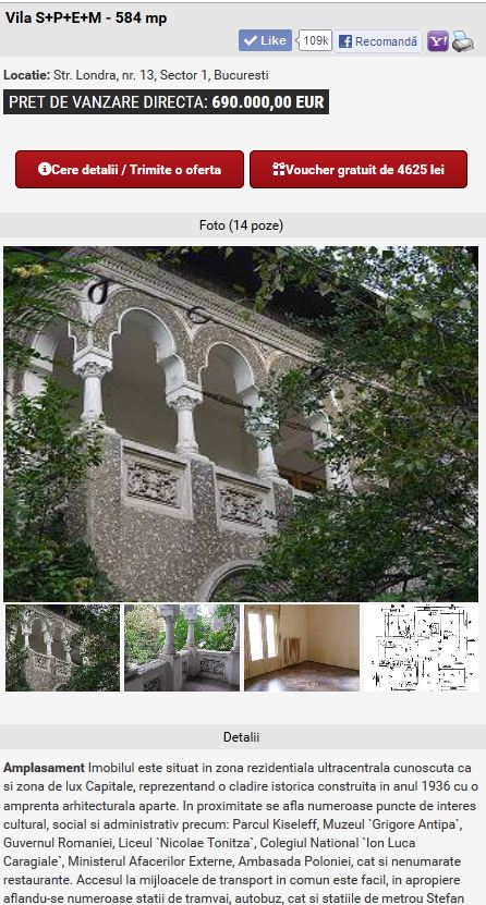 Imobilul a apartinut unuia dintre cei mai importanti jucatori de pe piata imobiliara, afaceristul Eduard Uzunov si a fostei lui sotii, Cristina Duma. Casa are subsol, parter, etaj si pod, are o amprenta la sol de 191 mp iar terenul pe care se afla are 446 mp. Casa a fost executata silit acum mai bine de doia ani, insa de atunci nimeni nu s-a aratat interesat s-o achizitioneze, cu toate ca pretul a scazut destul de mult.