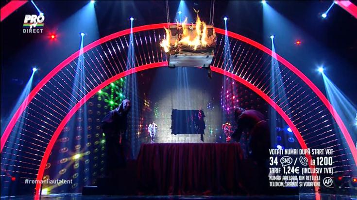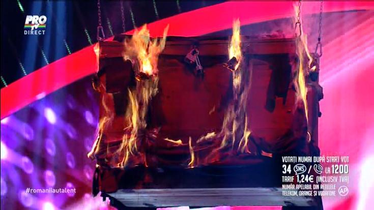 Robert Tudor a avut un numar absolut spectaculos. Barbatul a reusit sa vrajeasca nu doar juriul, ci si publicul. Dupa ce a facut un numar spectaculos cu carti, si-a postat pe contul de socializare cu o ora inainte de emisiune cartea pe care avea sa o aleaga Bebe Cotimanis in direct, a trecut la lucruri si mai grele. S-a urcat intr-o lada in flacari pentru ca la finalul momentului sa se transforme in pompierul care a stins focul.