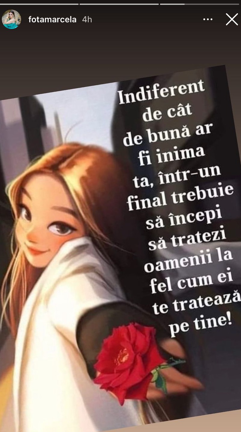 „Indiferent de cât de bună ar fi inima ta, într-un final trebuie să începi să tratezi oamenii la fel cum ei te tratează pe tine!”, a scris Marcela Fota pe Instagram.