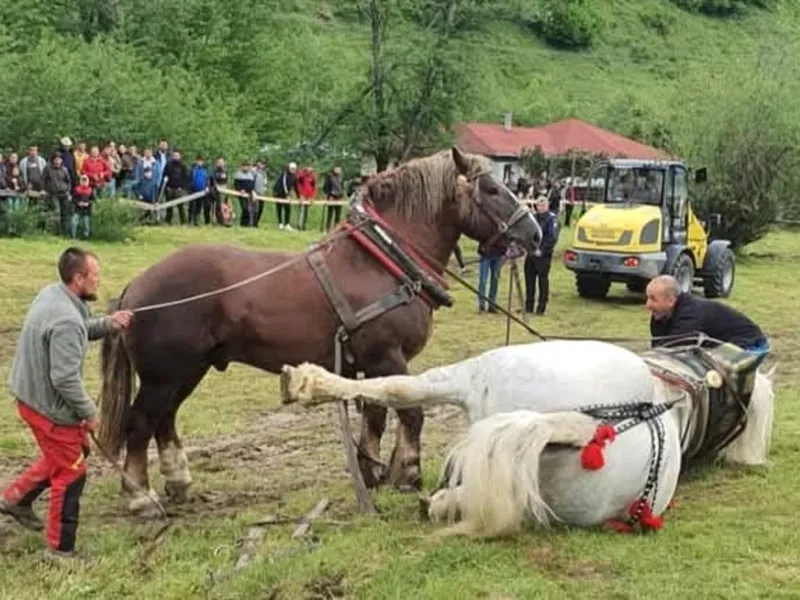 Întregul film al morții lui Falko, calul campion care s-a prăbușit imediat după ce a câștigat un concurs de tras bușteni! Ce i-ar fi provocat, de fapt, decesul: „L-au mai forțat 10 minute. Când a ajuns în dreptul meu, a căzut”