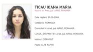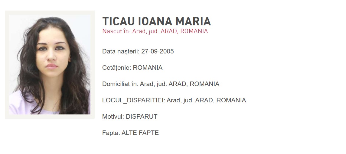 Autoritățile au fost sesizate privind dispariția lui Ticau Ioana Maria, în vârstă de 20 de ani, din Arad. Potrivit poliției, tânăra a plecat în mod voluntar de acasă pe data de 18 septembrie și nu s-a mai întors, iar familia, îngrijorată, a solicitate ajutorul oamenilor legii pentru găsirea ei.