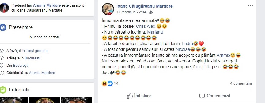 „A căzut la înmormântare înainte să mă acopere cu pământ: Aramis. Nu te-am ales eu, când o vei face, vei observa. Copiați textul si stergeți numele. puneți@ si la primul nume care apare, faceți clic pe el. Jucați!”, și-a îndemnat Ioana amicii.