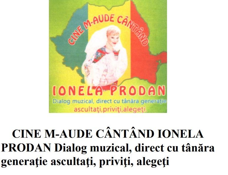 Este vorba despre o poza a Ionelei Prodan, in costum popular, pusa peste o harta a Romaniei, mesajul fiind „CINE M-AUDE CÂNTÂND IONELA PRODAN Dialog muzical, direct cu tânăra generaţie ascultaţi, priviţi, alegeţi”.( vezi ce face Anamaria Prodan cu colectia de costume populare a mamei ei)