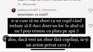 „N-ai cum să nu zbori cu un copil când trebuie să-l duci dintr-un loc în altul, că nu-l poți trimite cu pluta pe apă. Totodată, dacă vrei zbor fără copilași, ia-ți avion privat ceva. (…) E nevoie de puțină empatie pentru oamenii din jur și mai ales pentru niște copii/bebeluși care nu își pot controla emoțiile. Mă repet: nimănui nu-i place să audă urlete, dar vă spun eu în calitate de părinte că n-ai ce-i face dacă vrea să urle. Data viitoate când auziți un copil/bebeluș că urlă isteric puteți să întrebați părintele dacă are nevoie de ajutor și dacă nu are, întoarce privirea, pune căștile în urechi și gura.”, a încheiat vloggerița.
