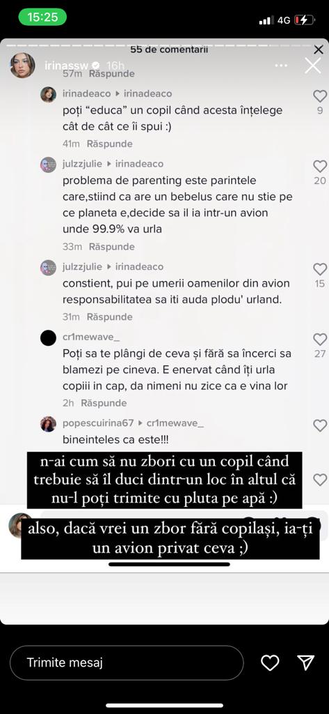 Irina Diaconescu a reacționat exprimându-și părerea despre situațiile în care există în avion copii care întâmpină o criză de plâns, iar cei din jur dunt nevoiți să asiste, fără voia lor, la scena în care cei mici nu pot fi controlați de părinții lor pentru a-i face să se liniștească. Totul a pornit după ce a văzut în mediul online o serie de comentarii din partea internauților care au afișat o atitudine deloc empatică. Fără să mai stea pe gânduri, influnecerița a transmis un mesaj tuturor celor care at comentat negativ pe baza acestui subiect.