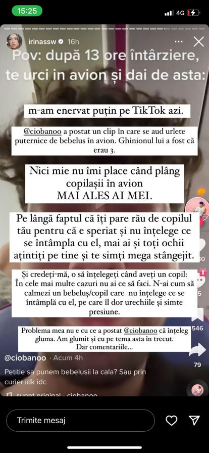 „M-am enervat puțin pe TikTok azi. @ciobanoo a postat un clip în care se aud urlete puternice de bebeluș în avion. Nici mie nu îmi place când plâng copii în avion, mai ales ai mei. Pe lângă faptul că îți pare rău de copilul tău, pentru că e speriat și nu înțelege ce se întâmplă cu el, mai ai și toți ochii ațintiți pe tine și te simți mega stânjenit. (…) În cele mai multe cazuri nu ai ce să-i faci. (…) Problema mea nu e cu ce a postat @ciobanoo, că înțeleg gluma, dar comentariile …”, a explicat Irina Deaconescu, pe InstaStory.
