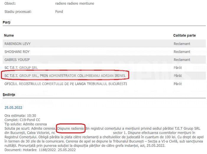 Irinel Columbeanu a ajuns în fața judecătorilor, după ce trei afaceriști au cerut radierea uneia dintre firmele pe care acesta le deține. Ulterior, pe portalul instanțelor a apărut și decizia magistraților: "Admite cererea. Dispune radierea din registrul comerţului a menţiunii privind sediul pârâtei T.E.T
