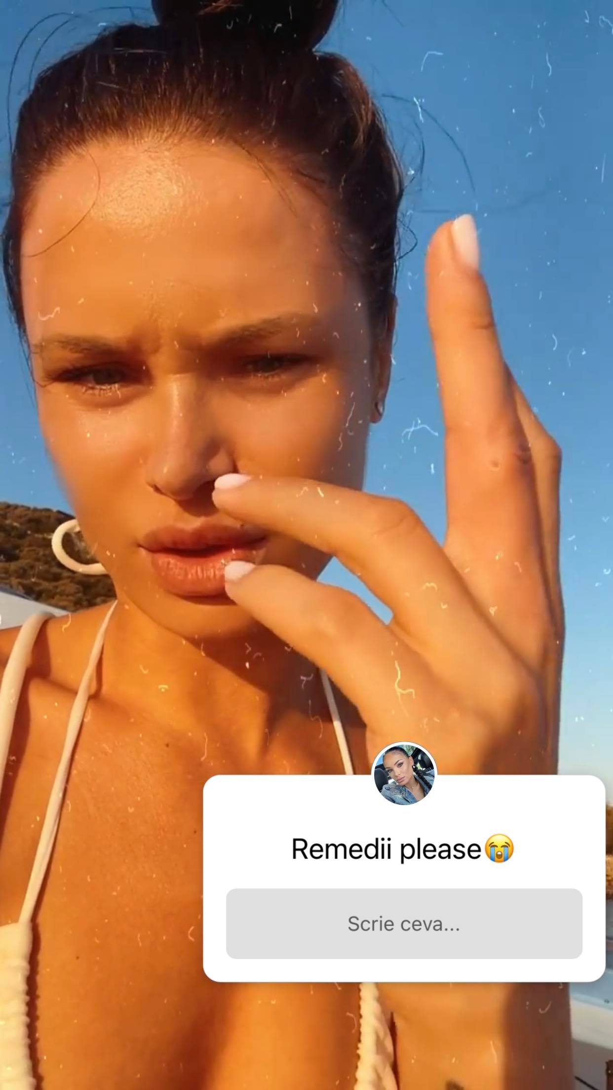 ”Groaznic, mi-a luat-o degetul razna, vai cum se umfla. Nu-mi vine sa cred. Macar am parte de un apus extraordinar de frumos”, a adăugat Irisha. ”M-am pus in pat ca mi se pare ca am asa o stare de ameteala, dar nu stiu, e de la faptul ca se misca barca sau e de la asta. Mi s-a fixat mie pe creier, mersi pentru remedii. Majoritatea dintre voi mi-ati zis sa frec cu sare, am frecat cu sare si am mai dat cu o chestie. Mi s-a umflat rau de tot si doare”, a mai spus artista.