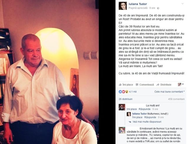 Iuliana Tudor este foarte mandra de parintii ei. Au o casnicie frumoasa de 40 de ani! In ziua in care celebreaza aniversarea mariajului lor, vedeta de televiziune le-a transmis un scurt mesaj. Cuvintele Iulianei sunt tare emotionante!