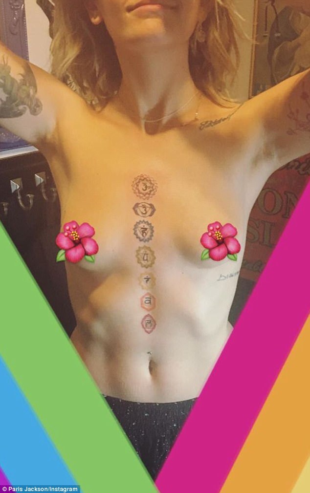 În fotografia publicată pe Instagram, Paris a ales să-şi acopere sfârcurile cu nişte emoji reprezentând flori. Desenele de pe piept reprezintă chackerele, ea dezvăluind de curând că este interesată de spiritualitate.