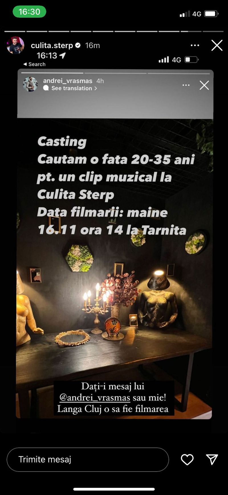 „Nu credeam că o să fac acest video și că voi fi nevoită să vin să clarific lucruri, însă vreau să fac acest video pe TikTok, pentru că am refuzat să apar în orice publicație din România și să dau un răspuns. (...) Vreau să vă spun că dacă eu nu eram în cunoștință de cauză și nu știam unde este Culiță, cu cine este în mașină și ce se întâmplă, de unde pleacă și până unde merge ați fi putut destrăma o familie, o familie din care ar fi avut de suferit un copil și familiile noastre, din care are de suferit o fată care nu are nicio vină, are de suferit și din punct de vedere al job-ului, pentru că voi intrați cu bocancii în viețile noastre.(...)”, a spus iubita lui Culiță Sterp în mediul online.