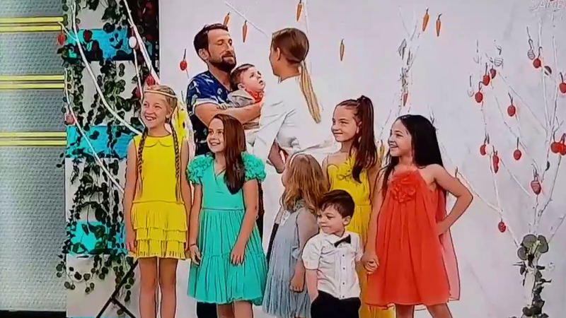 Răzvan Simion nu a putut rezista tentaţiei. L-a ridicat pe Dani de pe canapea şi l-a dus lângă Gabriela, iubita lui, provocându-i să pozeze ca o familie. Înconjuraţi de copilaşi, Gabriela şi Dani au fost luaţi la mişto de colegii din emisiune.