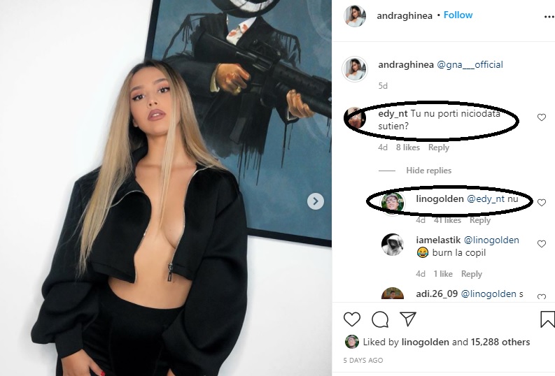 Andra Ghinea, iubita lui Lino Golden, este luată la rost pe rețelele de socializare după ce tânăra a impresionat cu fotografiile sexy pe care le postează. Mai exact, iubita trapperului este ochită de mai mulți internauți, după ce aceasta a ales să nu poarte sutien într-una din fotografii. Astfel, un tânăr o întreabă pe Andra Ghinea, pe pagina ei de Instagram, la secțiunea comentarii, dacă ea nu poartă deloc sutien. Răspunsul i-a șocat pe toți!