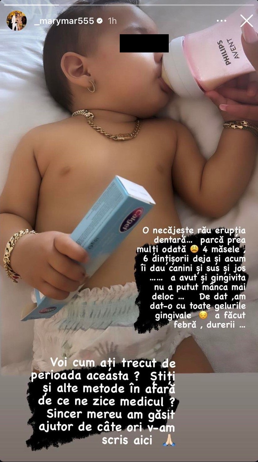 „O necăjește rău erupția dentară... parcă prea mulți odată. 4 măsele, 6 dințișori deja și acum îi dau caninii și sus și jos... a avut și gingivită. Nu a putut mânca mai deloc... De dat, am dat cu toate gelurile gingivale. A făcut febră, dureri... Voi cum ați trecut de perioada aceasta? Știți alte metode în afară de ce ne zice medicul? Sincer, mereu am găsit ajutor de câte ori v-am scris aici”,