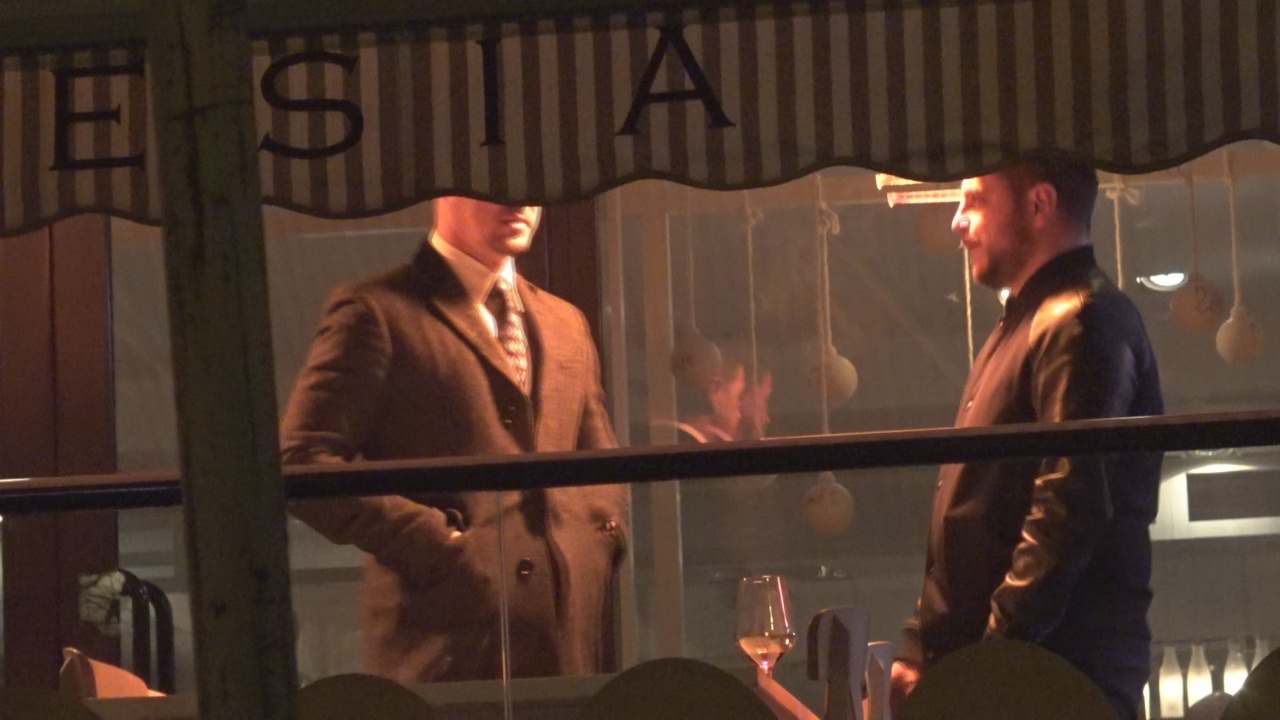 Imaginile îi prezintă pe cei doi bărbaţi discutând relaxat la o terasă din centrul Capitalei. Cei doi au ieşit pentru câteva minute în frig, timp în care Honorius a tras cu sete dintr-o ţigară, iar Adrian a întreţinut discuţia. După un timp, zgribuliţi, cei doi au intrat înăuntru şi şi-au continuat acolo conversaţia.