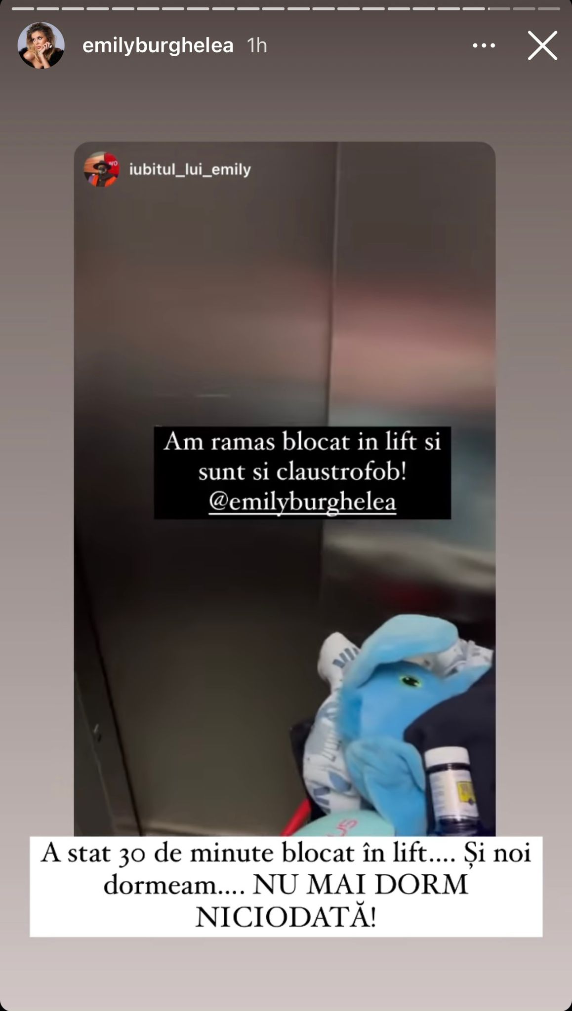 „Azi ne-am făcut somnul. Suntem fresh. Am mai fi dormit, dar ne-a trezit Andrei care a rămas blocat în lift. A stat 30 de minute blocat în lift… și noi dormeam. Nu mai dorm niciodată”, a povestit Emily Burghelea pe pagina sa de social media.