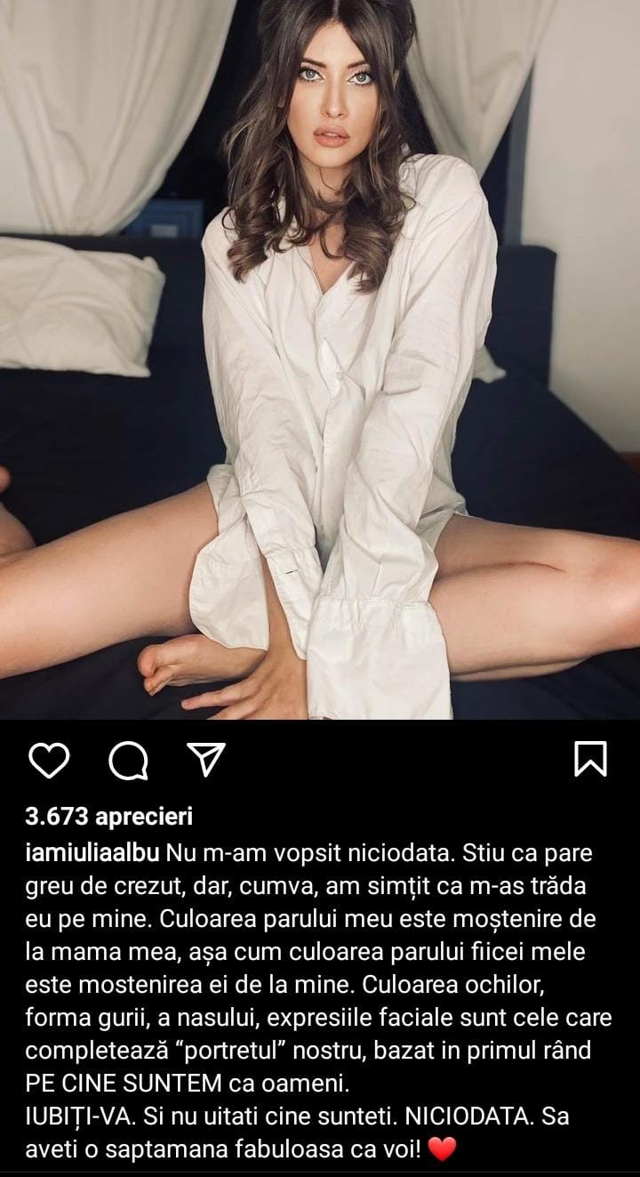 ”Nu m-am vopsit niciodată. Știu că pare greu de crezut, dar, cumva, am simțit că m-aș trăda eu pe mine. Culoarea părului meu este moștenire de la mama mea, așa cum culoarea parului fiicei mele este moștenirea ei de la mine”, a scris Iulia Albu pe contul său de Instagram.