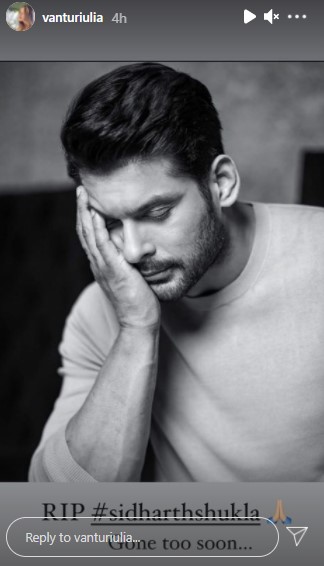 Este vorba despre Sidharth Shukla, cu care Iulia Vântur ar fi colaborat în trecut și cu care este destul de apropiată. Tocmai din acest motiv, ea a ținut să transmită un mesaj pe pagina ei de Instagram în memoria acestuia.„Ai plecat prea devereme./ Viața este atât de neprevăzută. Odihnește-te în pace, Sidharth Shukla! Condoleanțe familiei și tuturor celor care l-au iubit”, sunt mesajele postate de Iulia Vântur pe rețelele de socializare.