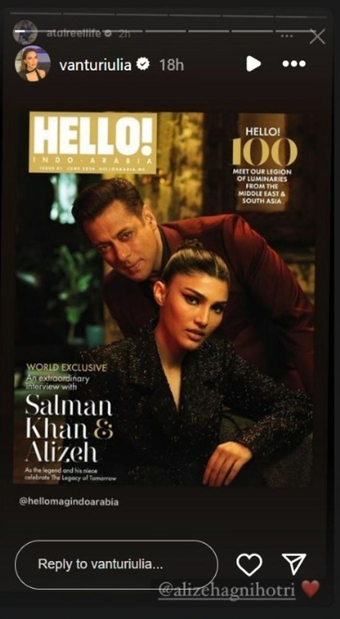 Văzând fotografia cu Salman Khan și nepoata sa, Iulia Vântur nu a stat pe gânduri și a reacționat rapid. Pe rețelele de socializare, fosta prezentatoare TV a repostat imaginea respectivă, a etichetat-o pe Alizeh și a adăugat chiar și o inimioară, demonstrându-le tuturor cât de apropiată este de nepoata iubitului ei.