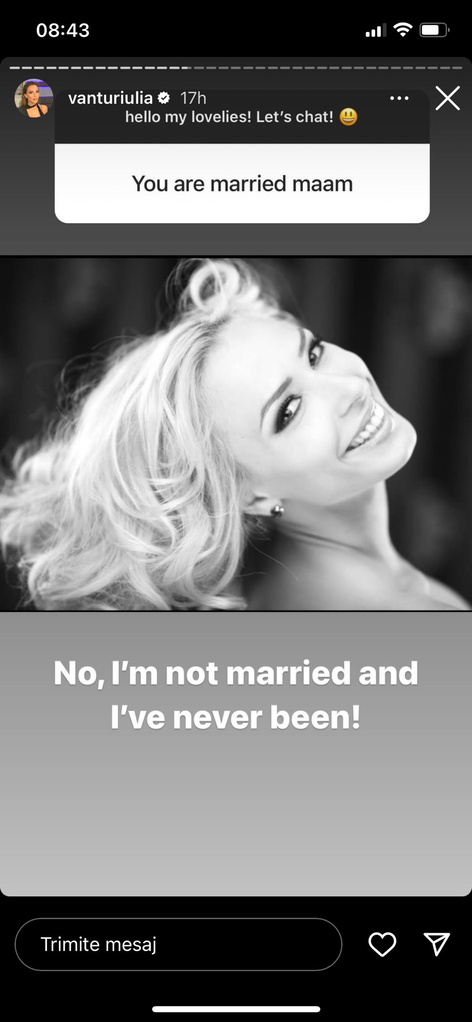 „Nu, nu sunt măritată și nu voi fi vreodată”, a spus Iulia Vântur pe Instagram.