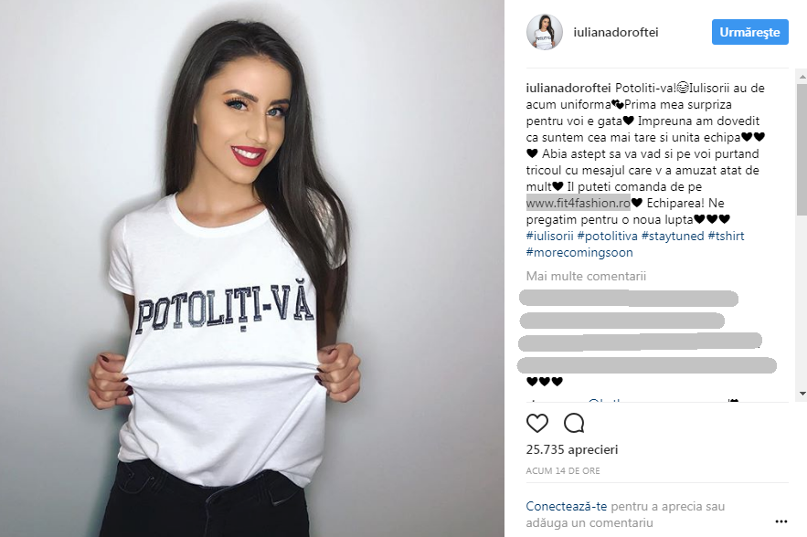 Iuliana Doroftei, castigatoarea “Bravo, ai stil!”, sezonul 3, le-a facut o surpriza fanilor ei pe care ii alinta “iulisori”. Tanara a lansat o linie de tricouri si hanorace albe si negre, atat pentru barbati, cat si pentru femei, inscriptionate cu mesajul “Potoliti-va”.