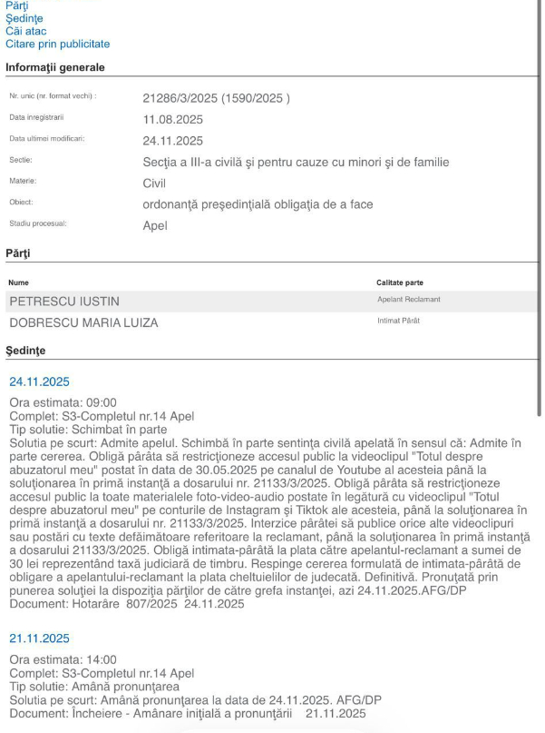 Iustin Petrescu a cerut instanței să o oblige pe Marilu să șteargă videoclipul în care vorbește despre el, acela cu titlul ”Totul despre abuzatorul meu”. Instanța nu i-a dat câștig de cauză în primă fază influencerului, motiv pentru care a făcut apel, iar astăzi, 24 noiembrie, bărbatul a câștigat definitiv ordonanța președințială împotriva lui Marilu Dobrescu.