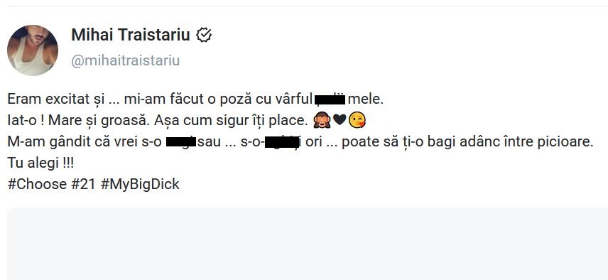 ”Omul și-a instalat pe Instagram un bot (robot n.r.) care dă automat mesaje cu ”join my onlyfans account” (abonează-te la contul meu de onlyfans). Și acolo s-au întâmplat două lucruri total greșite. Primul lucru: botul ăla nu știe să diferențieze vârsta și a trimis la multe fete sub 18 ani chestia aia… Foarte nasol. Iar a doua chestie e că eu am o poză în telefon cu p***ul lui Mihai Trăistariu pe care n-am solicitat-o niciodată. Omul, efectiv, mi-a dat mesaj… Vă jur că n-am solicitat așa ceva. El mi-a trimis poză, e contul lui verificat!…”, a povestit Selly la emisiunea online pe care o realizează pe Youtube.