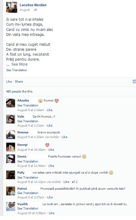 Va continua sa se distreze probabil… Pe seama fanilor naivi! De curand, pe pagina personala de Facebook el a postat mai multe versuri. Fanii si mai ales admiratoarele nu au mai contenit cu laudele, iar Lacatus, care de obicei le raspundea acestora, s-a abtinut de aceasta data.