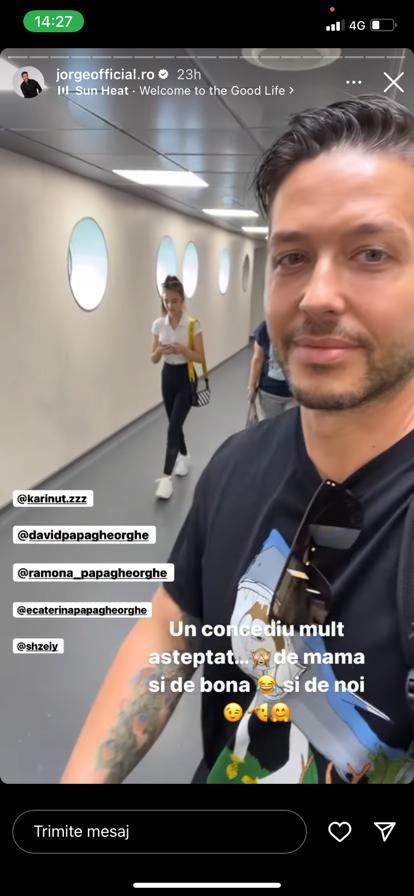 „Mi familia… in alta formula, de data asta doar cu Karina si David insa alaturi de mama mea minunata si bona noastra preferata 😂. Avem sanse sa ne si relaxam vacanta asta. Va pupam”, a scris Jorge p Instagram, imediat după ce au ajuns la destinație.
