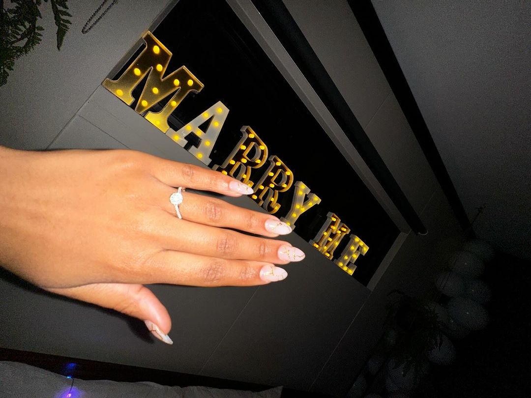 În urmă cu câteva ore, jucătorul favorit al lui Becali a postat o fotografie cu prietena lui, Mbali Malindi, în care ea poartă cu mândrie inelul pe deget, într-o cameră în care pe fundal scria „Marry Me” (n.r. Căsătorește-te cu mine!”). Mai mult, în dreptul imaginilor, Ngezana a scris: „Logodit cu dragostea mea din copilărie”.